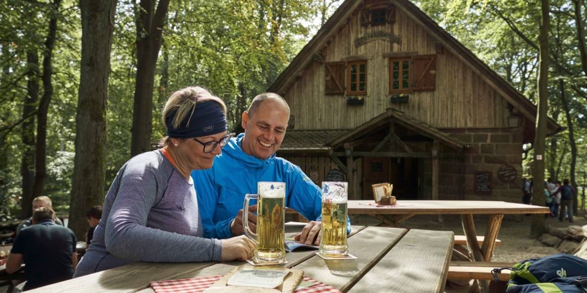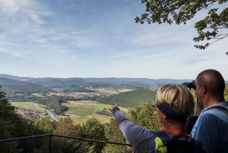 Von hier aus führt Sie der Kammweg steil bergauf bis zur sagenumwobenen Teufelskanzel auf 452 Meter Höhe. Genießen Sie den sagenhaften Ausblick auf die Werraschleife bei Lindewerra. An der Stelle, an der der Teufel ein Nickerchen gehalten haben soll, können Sie sich zur Rast niederlassen. Wenn Sie möchten, gern auch im urigen Wirtshaus Teufelskanzel.